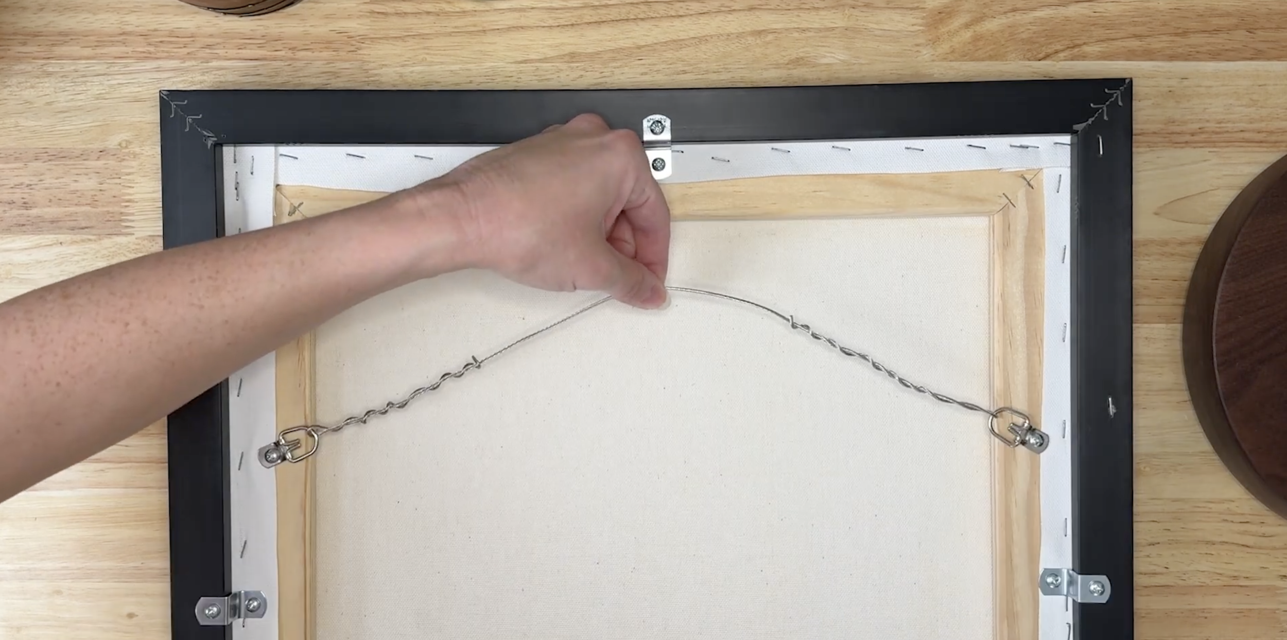 Once your canvas is framed, attach your preferred hanging hardware. I personally love using D‑rings and wire.