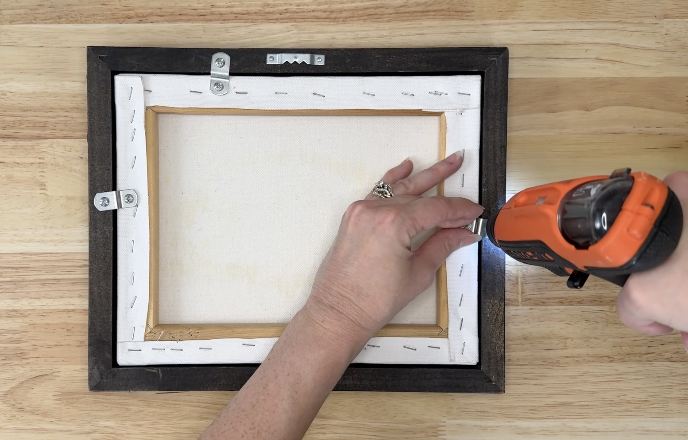 Set your canvas into the back of the frame. Make sure it’s sitting evenly.